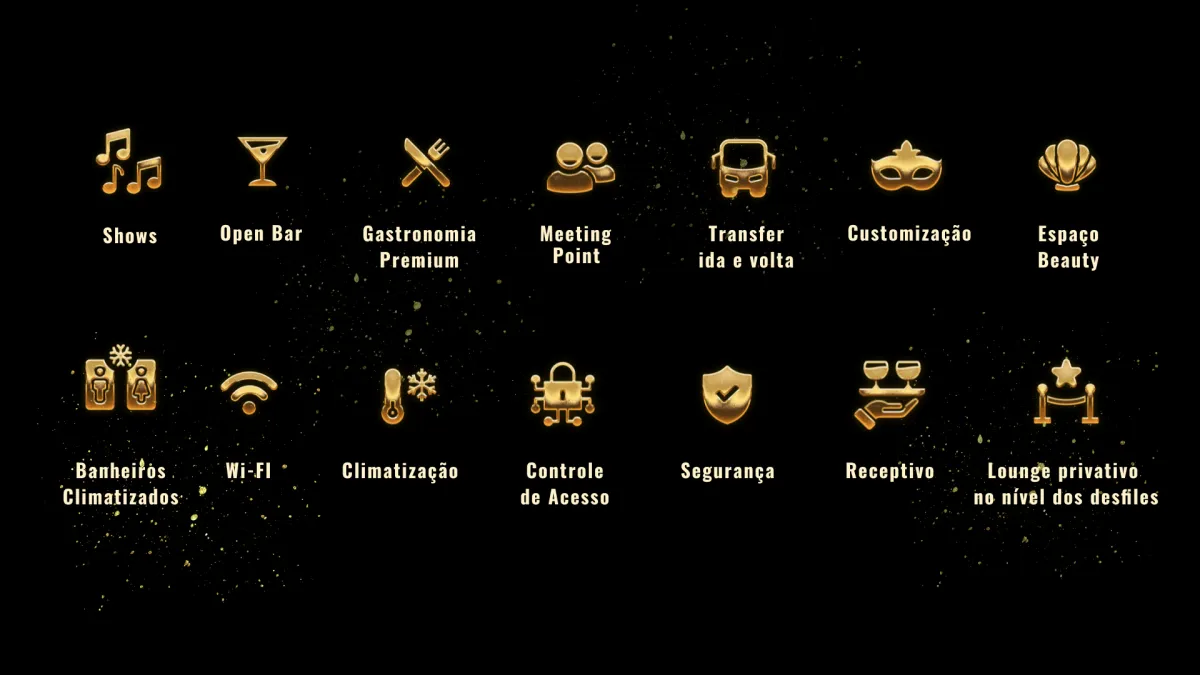 O ingresso dá acesso ao camarote durante toda a noite de desfiles e inclui: